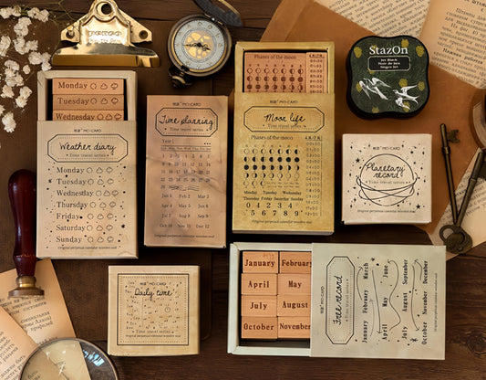 Vintage Calendar Month Week Weather Rubber Stamp | Retro Wooden Stamp Set | Moon Phase | Scrapbooking Journal Collage Planner Stamp Supplies