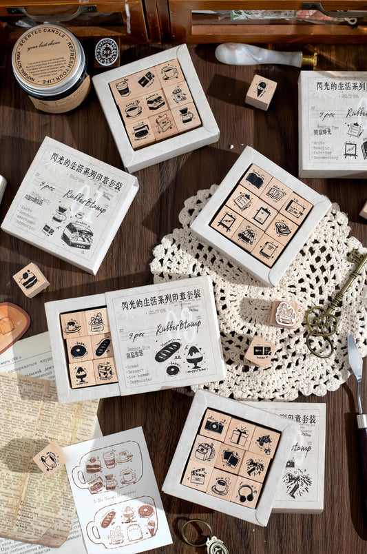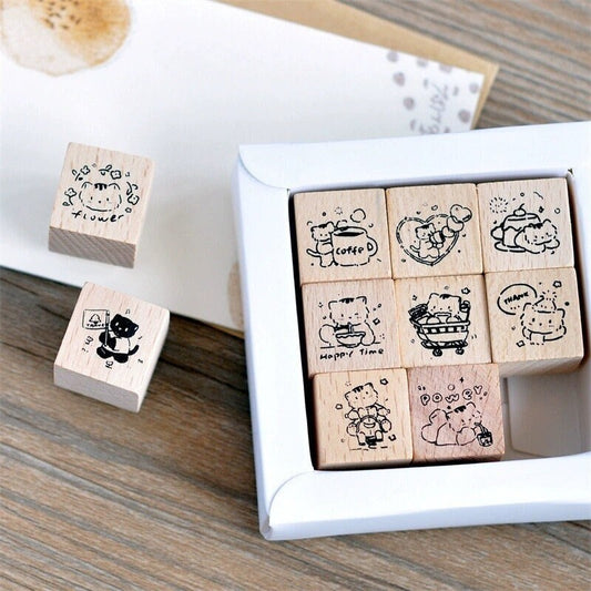 9pcs Cute Coffee Reading Study Dessert Rubber Stamp | Wooden Stamp Set | Daily Plan Schedule Planner Bullet Journal Stamp