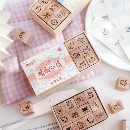 16pcs Cute Mini Icon Rubber Stamp | Wooden Stamp Set | Weather Mood Travel Study Health Daily Plan Schedule Planner Bullet Journal Stamp