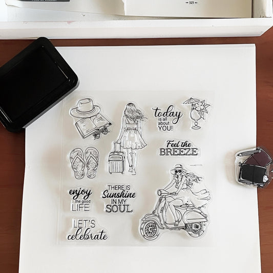 Traveling Girl Clear Stamp | Travel Lover Self Care Transparent Rubber Stamps | Card Making Craft Scrapbooking Supplies