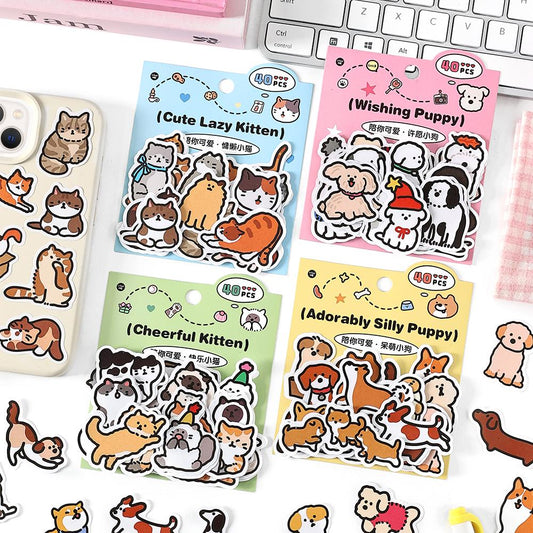 40pcs Cute Puppy Kitten Sticker | Cute Handdrawn Cat Stickers | Kawaii Animal Planner Stickers Junk Journal Scrapbooking Supplies